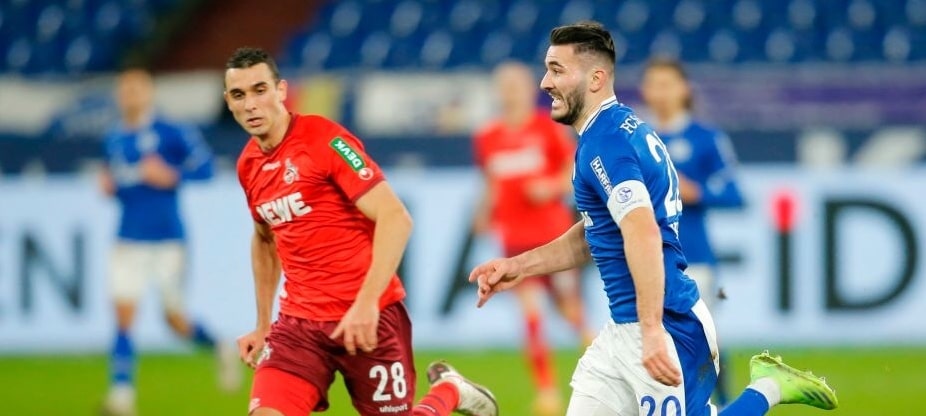 Cologne's Tunisian midfielder Ellyes Skhiri (L) and Schalke's German defender Sead Kolasinac vie for the ball during the German first division Bundesliga football match Schalke 04 v 1 FC Cologne in Gelsenkirchen, western Germany, on January 20, 2021. (Photo by LEON KUEGELER / POOL / AFP) / DFL REGULATIONS PROHIBIT ANY USE OF PHOTOGRAPHS AS IMAGE SEQUENCES AND/OR QUASI-VIDEO (Photo by LEON KUEGELER/POOL/AFP via Getty Images)