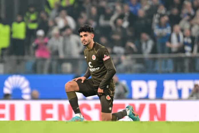 Schaut enttäuscht, betrübt, deprimiert, frustriert, geknickt, gekränkt, niedergeschlagen, unzufrieden, ernüchtert, schlecht gelaunt: Elias Saad (26, FC St. Pauli)