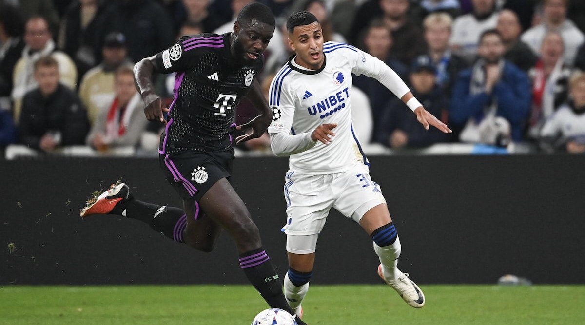 Bayern Munich's French defender #02 Dayot Upamecano (L) and FC Copenhagen's Tunisian forward #30 Elias Achouri vie for the ball during the UEFA Champions League Group A football match between FC Copenhagen and FC Bayern Munich in Copenhagen, Denmark on October 3, 2023. (Photo by Sergei GAPON / AFP) (Photo by SERGEI GAPON/AFP via Getty Images)